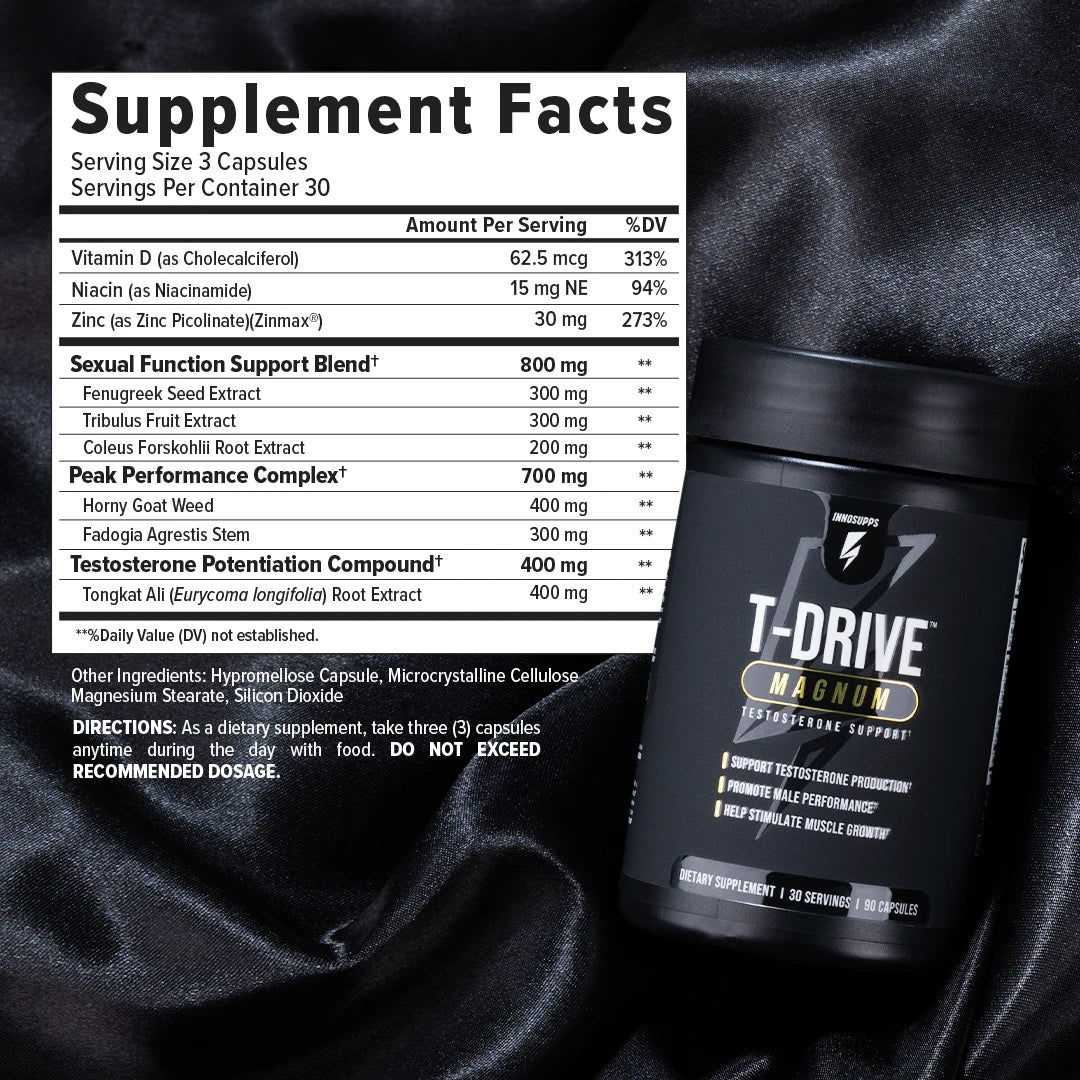 Both T-Drive™ and T-Drive™ Magnum help boost testosterone levels to achieve peak masculinity and help overall male vitality. T-Drive™ Magnum features clinically proven testosterone-boosting ingredients, igniting your body's testosterone production to achieve optimal levels of free and total T. With powerful ingredients like Fadogia Agrestis and Tongkat Ali, scientifically proven to stimulate testes for heightened testosterone production and estrogen prevention, expect an amplified sex drive, improved erectile function, a bolstered sense of confidence, and more!"*