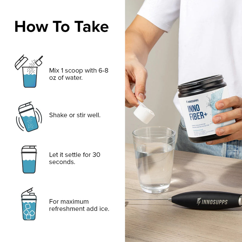 Add one scoop of Inno Fiber+ to 6-8 oz of cold water. Starting out? Use half a scoop for the first 3-5 days.