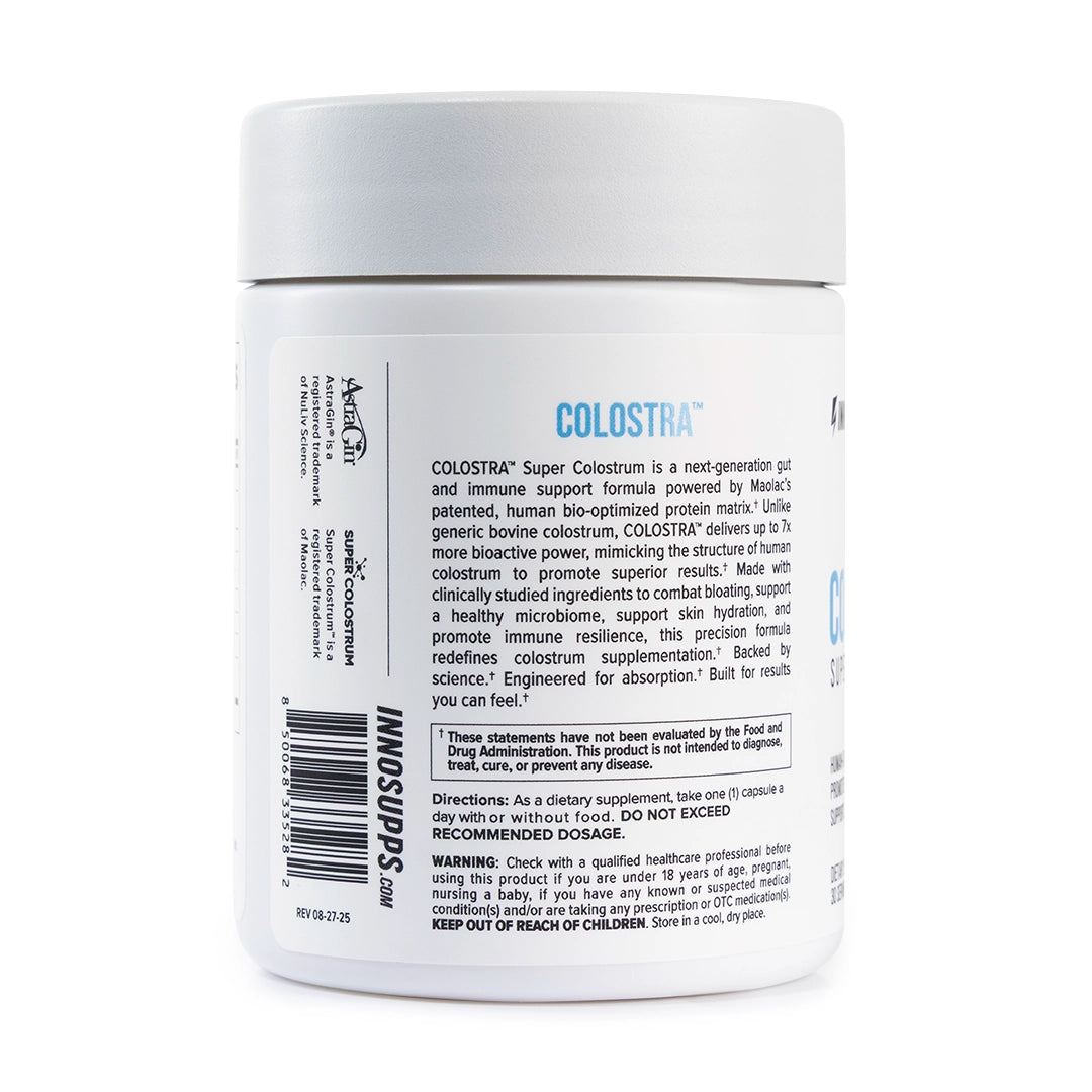 COLOSTRA™ features Super Colostrum™ — a human-optimized form of colostrum enhanced for superior bioavailability. It uses cutting-edge technology to isolate the proteins most beneficial for human absorption, mimicking the bioactives in human breast milk. Additionally, it's protected by a heat- and acid-resistant shield and boosted with AstraGin® to maximize uptake and deliver fast, effective results.