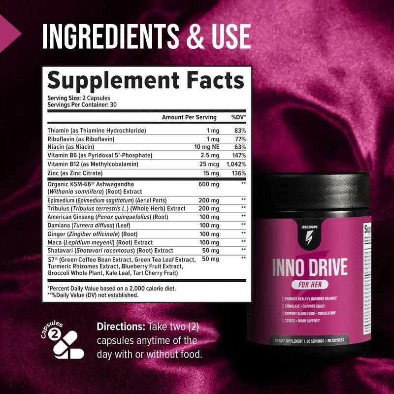 We recommend taking Inno Drive: For Her for a minimum of 90-180 days to achieve maximum results in drive, satisfaction and physical performance to experience benefits* such as: